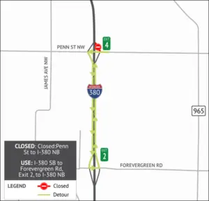 The Iowa Department of Transportation announced that beginning Tuesday, the Penn Street to Interstate-380 northbound ramp is anticipated to close for up to three months to allow for reconstruction. During the closure, northbound ramp traffic will be detoured south on Interstate 380 to the Forevergreen Road exit and back northbound. The Iowa Department of Transportation urges drivers to use caution around the work site, expect delays and allow extra travel time, and find alternative routes when possible.