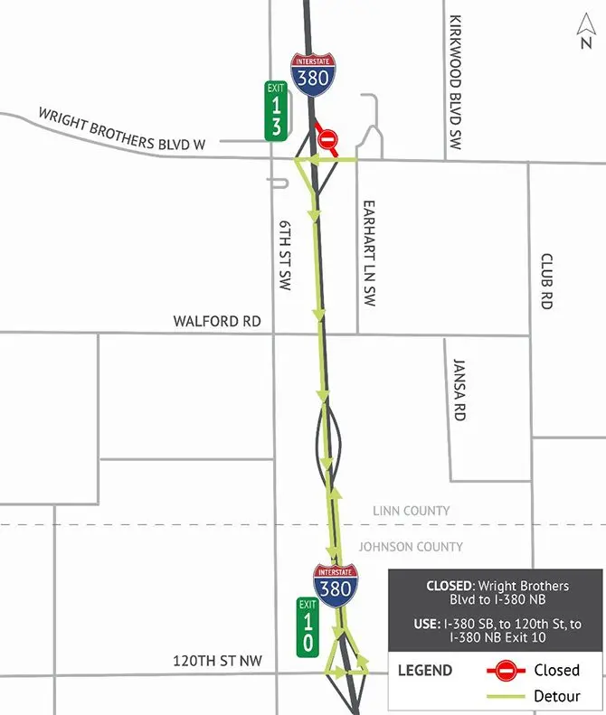 CEDAR RAPIDS, IOWA – Weather permitting, the Wright Brothers Boulevard to I-380 Northbound On-Ramp will be closed overnight Sunday, June 15th, beginning at 10 PM until Monday, June 16th, at 6 AM. Traffic will be detoured south on I-380, where it can return north at Exit 10, 120th St NW. See the map below for detour details.