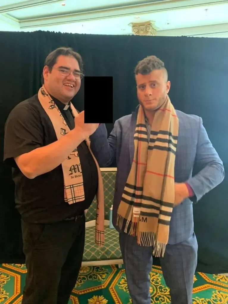 Treviño was not the stereotypical Catholic priest, as he enjoyed professional wrestling to the point that he regularly travelled to various television and pay-per-view events, often posing with wrestlers while still wearing his liturgical vestments. He once told KCJJ one of his favorite wrestling photos was taken last year in London when he met then-All Elite Wrestling World Champion, and the promotion’s top heel, MJF (seen below).